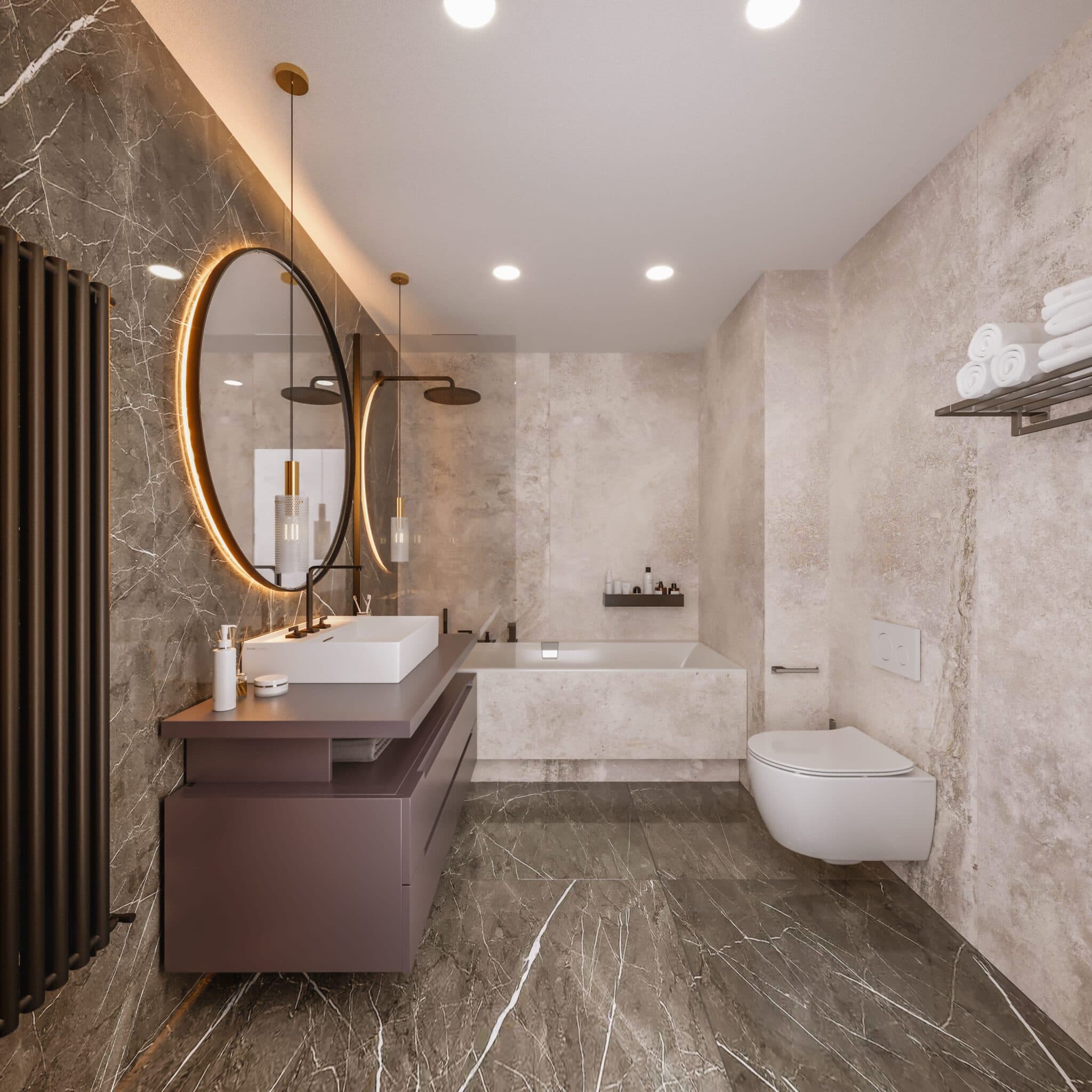 Investor slibuje ve viladomech vysoký standard již v základním provedení – například velkoformátové dlažby a obklady od italského výrobce Marazzi nebo sanitární vybavení od německých značek Ideal Standard (sanitární keramika), Kaldewei (vany) či Hansa (vodovodní baterie).