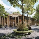 Samotný pavilon je tvořen několika panely, které společně ohraničují kruhový prostor hřiště. Půdorysná stopa pavilonu kopíruje původní betonovou kruhovou zeď, která zde léta čekala bez využití. Jako materiál bylo vybráno měkčí smrkové dřevo, jehož povrchová úprava je ošetřena přírodními oleji. Panely společně fungují jako celek, jednotlivě se však liší a přinášejí různé funkce – najdeme zde zabudované lavice, úkryty, úložné prostory, tabule na kreslení, šplhací lana či žebříky.