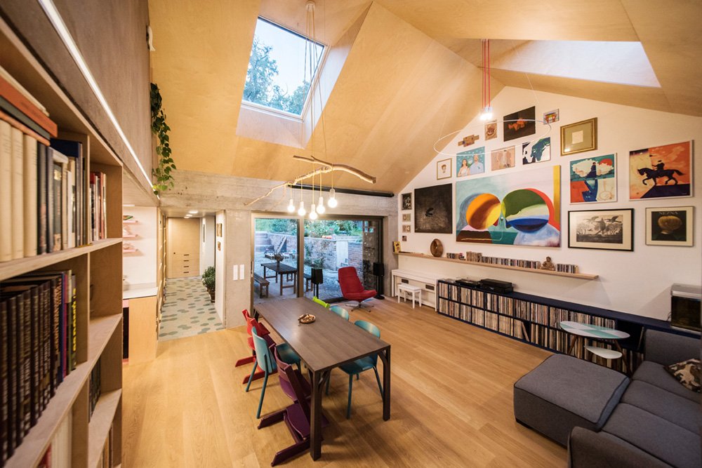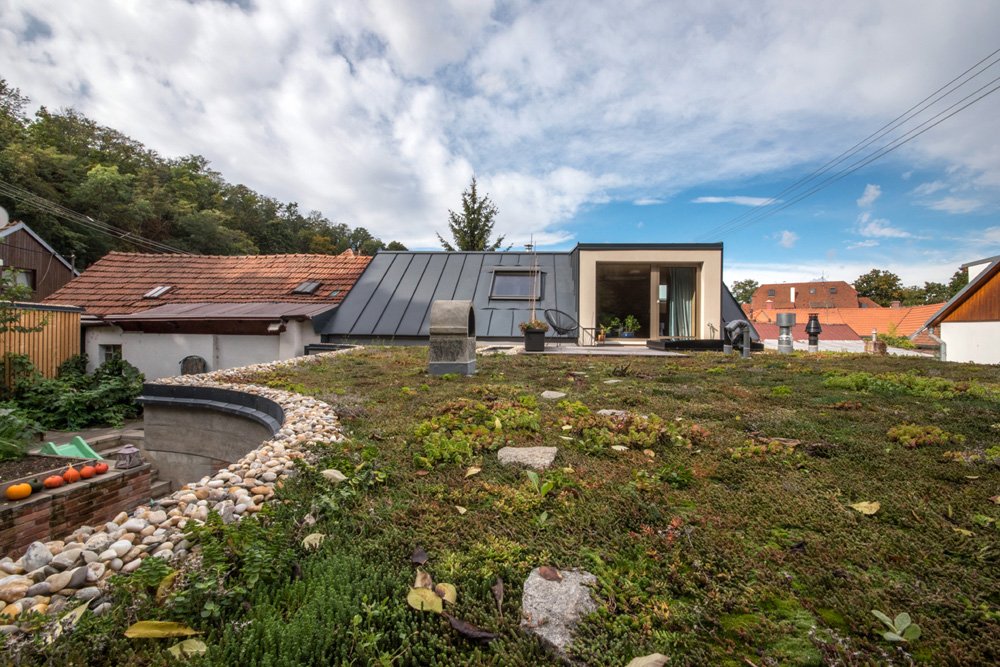 Ploché střechy přístavby jsou řešeny jako extenzivní zelené, nad hlavní hmotou doplněné o menší pobytovou terasu. V prostředí, kde nevládne prostor, se každý čtvereční metr počítá.
