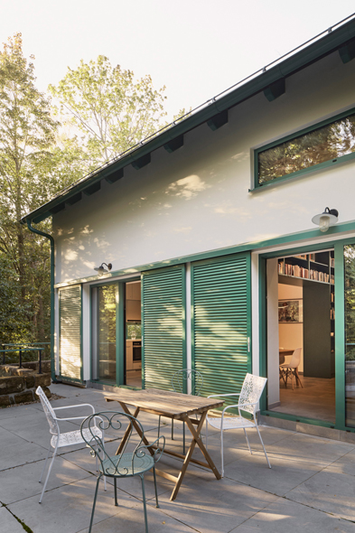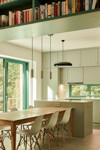 Architekti k tradičnímu základu přidali odvážné akcenty v zelené barvě. Novou barvu mají okna, okenice, kuchyňské prvky. Zelená propojuje exteriér s interiérem a zároveň symbolicky připomíná, odkud dům vychází – z krajiny. Barevná kontinuita sjednocuje dům a ukotvuje jej v místě, aniž by sklouzávala k historizujícímu kýči.
