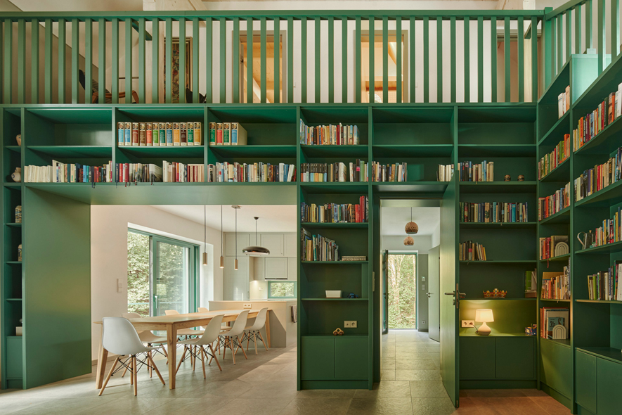 Vstoupíte dovnitř a první, co vás zaujme, je velká knihovna, která rozděluje i propojuje zároveň. Přes její portál se prochází do kuchyně, kde je všechno blízko a logicky na svém místě. Dominantní cihelný krb s posezením odkazuje na klasickou pec, jedná se o architektonický i psychologický střed domu. Cihla, surový archetypální materiál, funguje jako protiváha jemně laděné barevnosti knihovny.