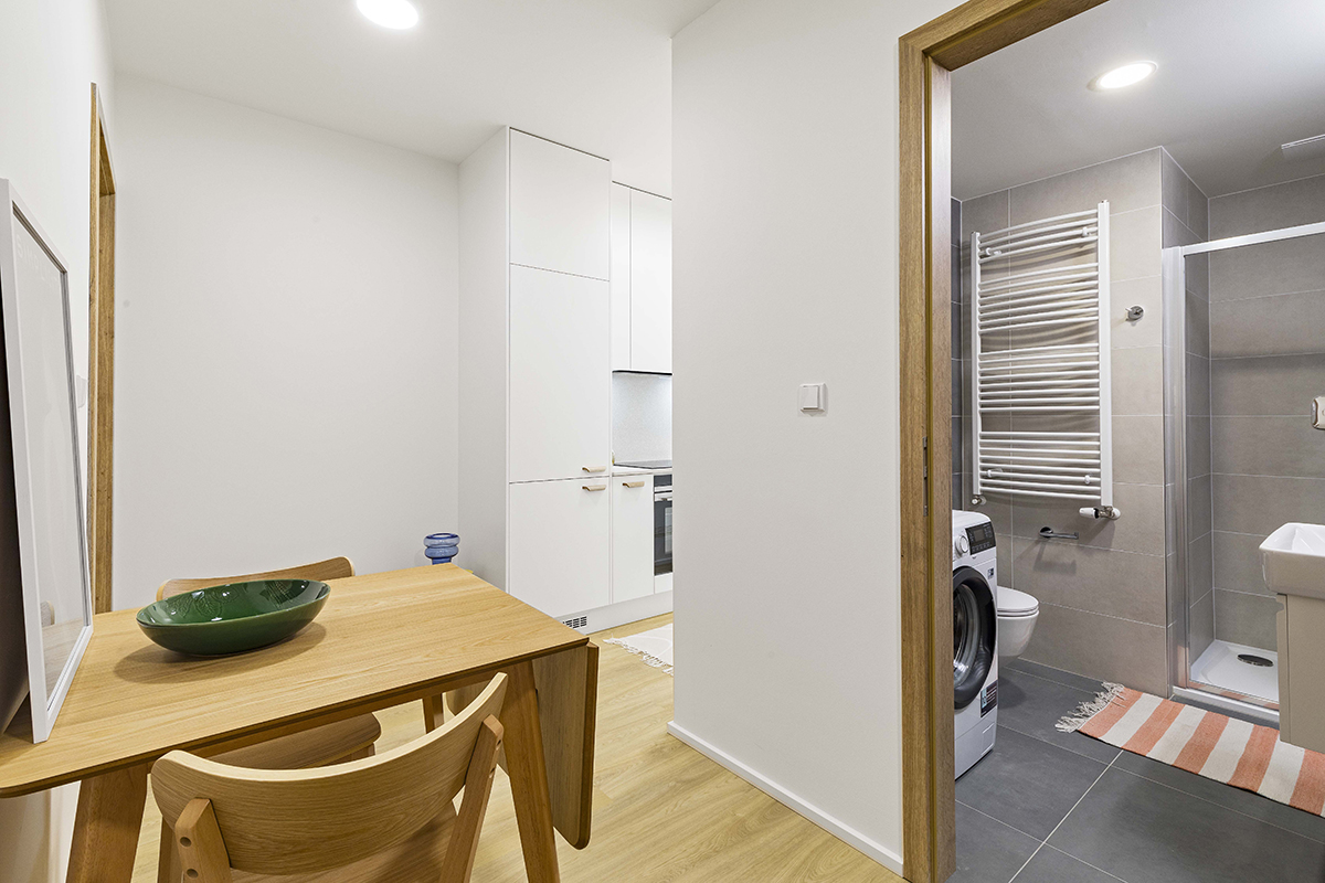 Vnímali jsme i to, že při vývoji sérií spolupracují s předními designéry, například Maximem Velčovským,“ říká architekt Prokop Tomášek a dodává: „Neutrální barevnost kolekcí byla variabilním standardem. V projektu jsou stovky bytů, proto jsme cílili na univerzálnost. Klientské změny vždy vyžadují dodatečné bourání a jsou destruktivní jak pro developera, tak pro obyvatele, kteří se již zabydleli. Stejná barevnost a formáty jsou použity i ve vstupních halách.“