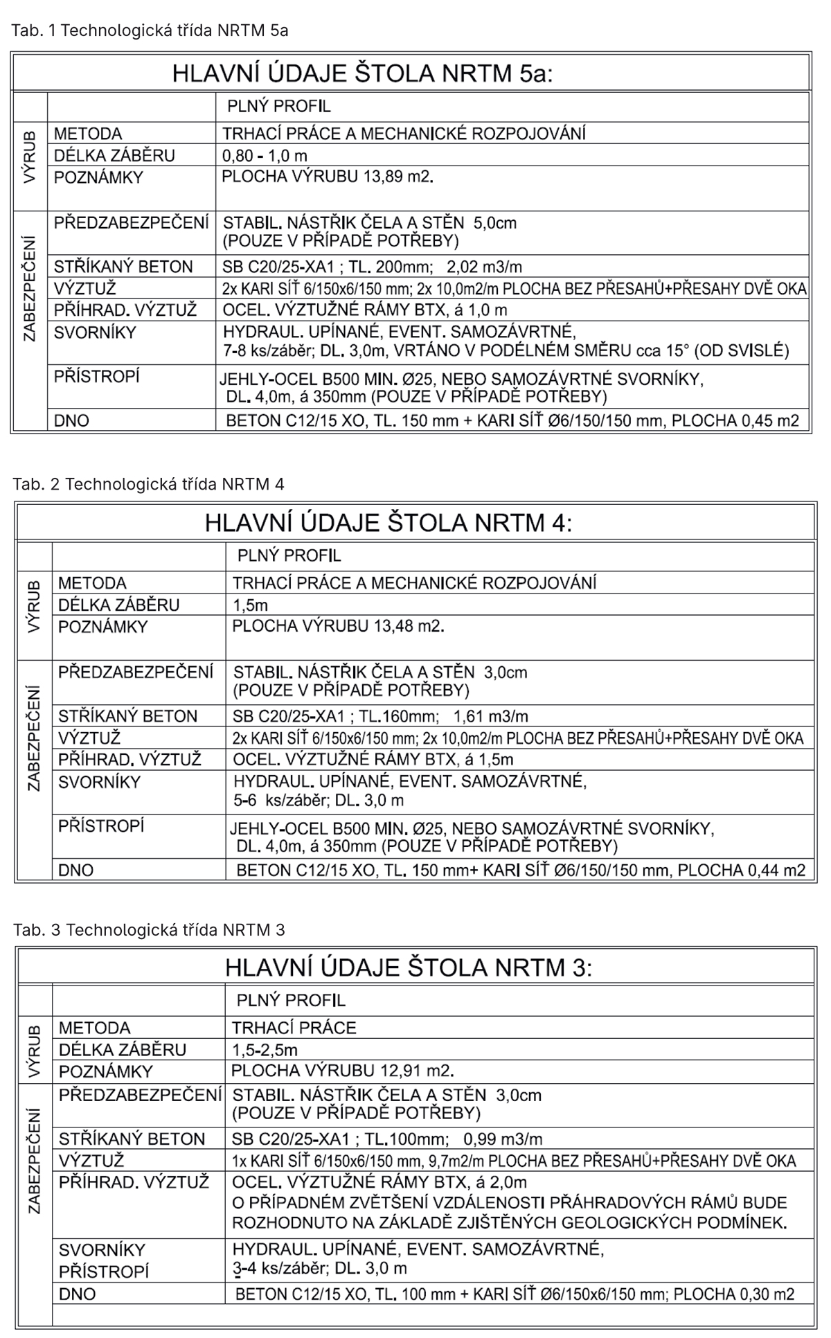 Technologické třídy (TT) NRTM štoly jsou navrženy v závislosti na geologických podmínkách, velikosti výrubu a reakcích horniny na provedení výrubu do jednotlivých vystrojovacích tříd NRTM 3, 4 a 5a. TT NRTM jsou zatřiďovány dle vztahu kvality horniny vyjádřené klasifikací QTS, velikostí výrubu a reakcí horniny na provedení výrubu. Sekundární ostění není navrženo, jedná se o dočasné průzkumné dílo.