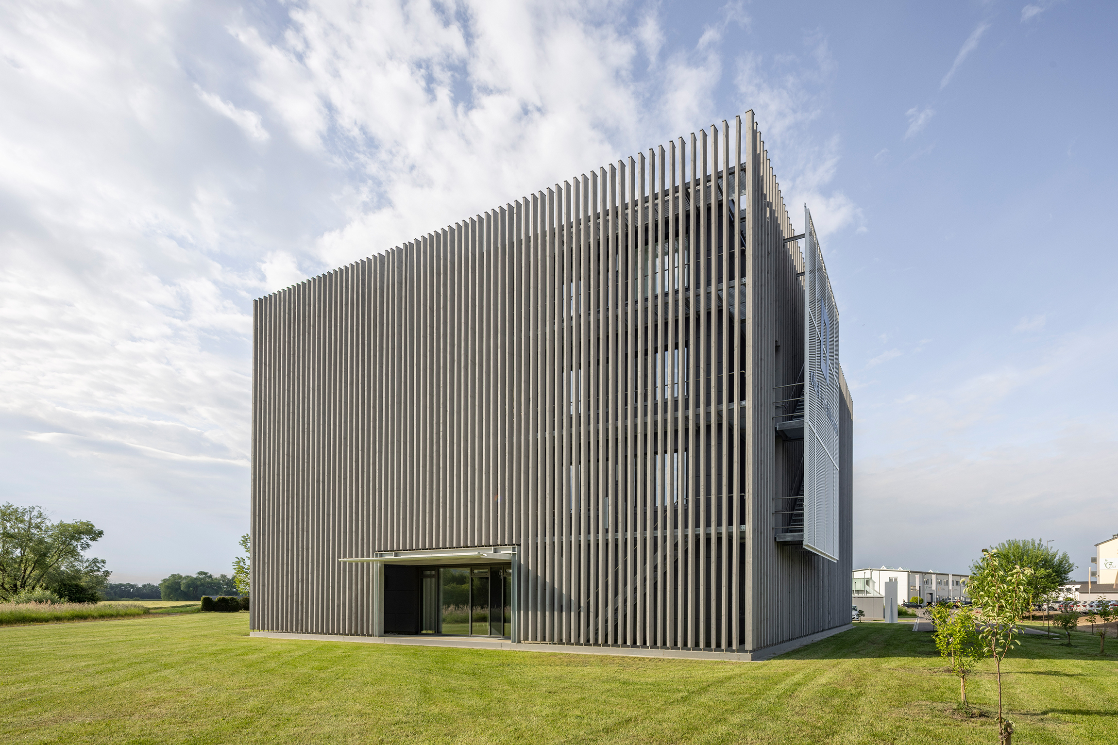 Architektonický vzhled novostavby je do značné míry definován předsunutou dřevěnou fasádou z lamel. Svisle uspořádané lamely z borovicového dřeva, každá o délce 14 m a šířce 80 mm, vytvářejí živou hru světla a stínu a dodávají budově vzhled téměř sochařského díla. „Zároveň chrání plášť budovy před přímým slunečním zářením, čímž zabraňují přehřívání fasády v létě a přispívají k pasivnímu chlazení,“ vysvětluje architekt Wolfgang Obel.