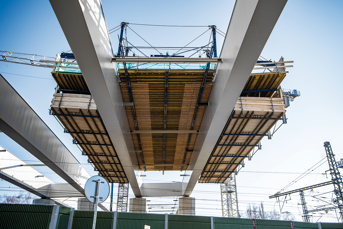 Jedním z klíčových prvků výstavby jsou monolitické konstrukce kompozitní mostní stavby, jejichž realizace vyžaduje pokročilé inženýrské technologie. Společnost Doka v tomto projektu hraje zásadní roli jako dodavatel speciálních bednicích systémů, jejichž použití umožnilo efektivní stavbu nosných konstrukcí estakády i propojení ocelových a betonových konstrukcí.