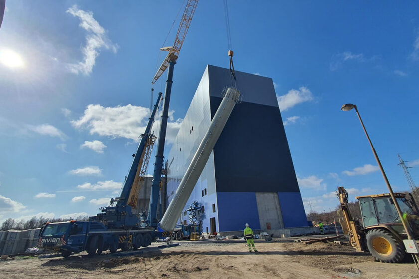 Stavbaři Metrostavu CZ dokončují nosné konstrukce i opláštění a zastřešení hlavního výrobního bloku, jehož součástí je kotelna, čištění spalin i bunkr odpadu. Vizuálně nejvděčnější fází však bylo aktuální osazování komína.