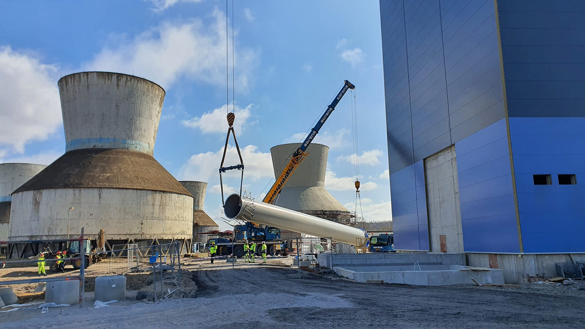 Jeřáby osadily komín pro novou teplárnu na odpad v Komořanech