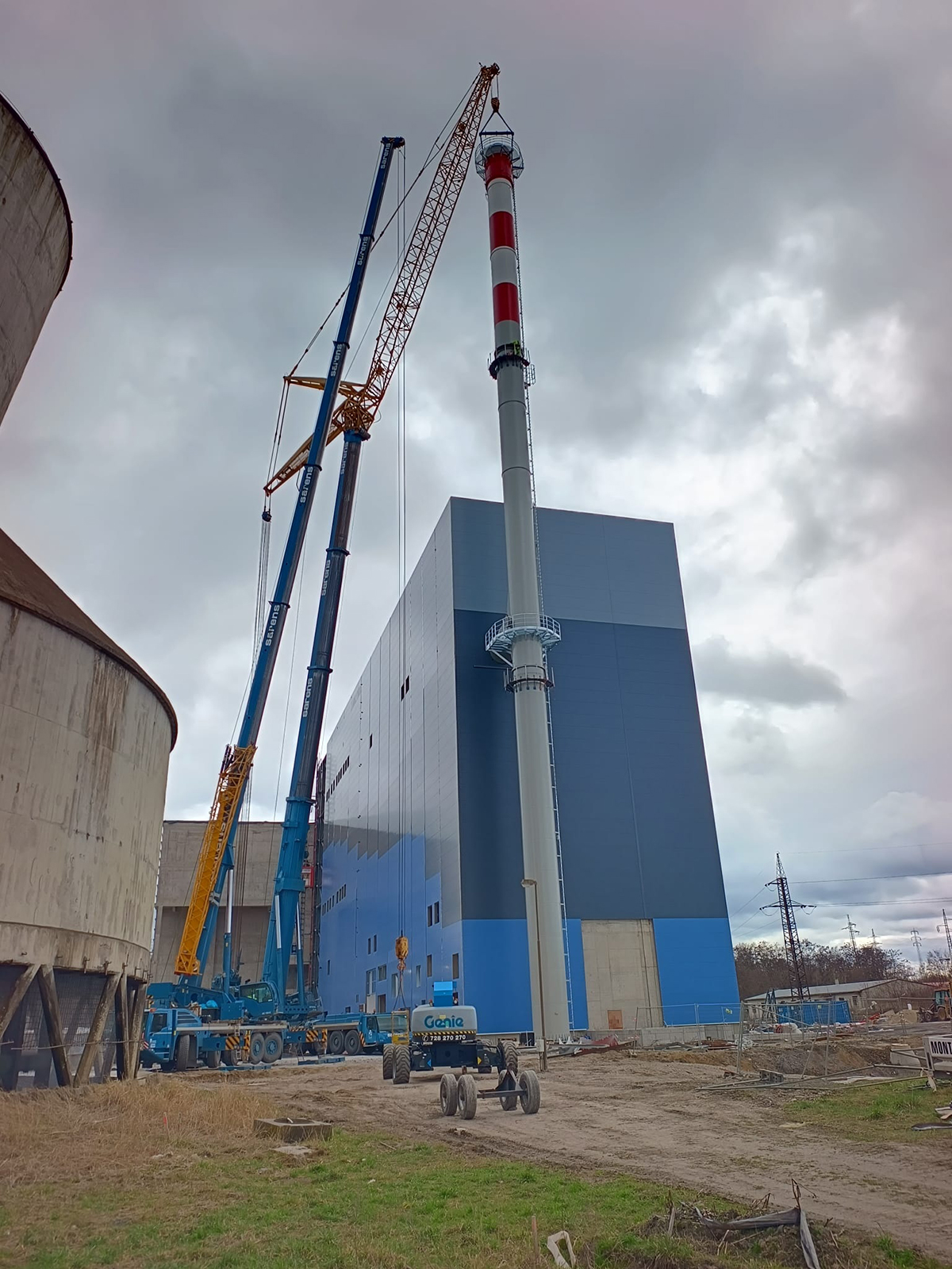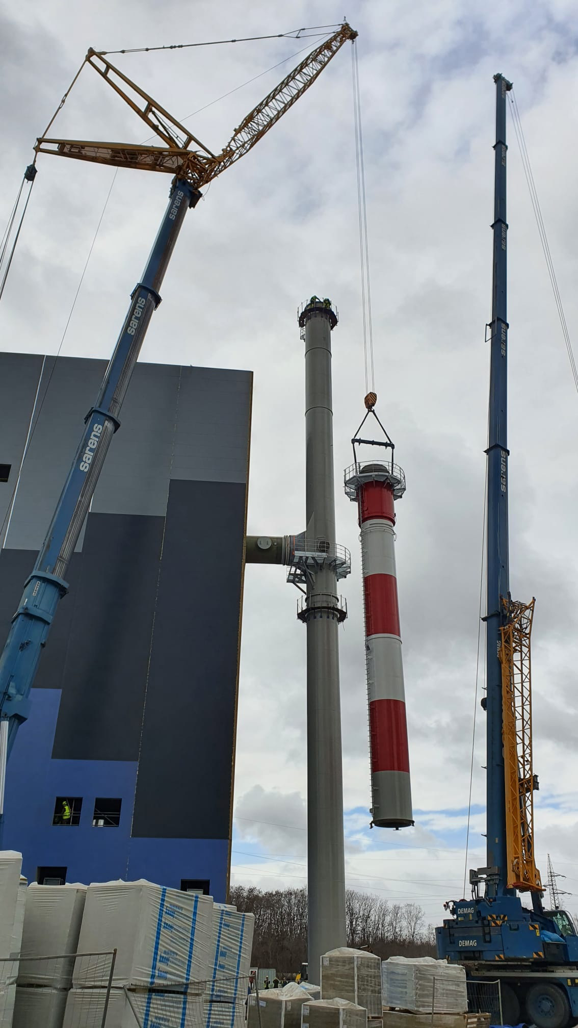 „Spodní část prvního komínového dílce uchopil pomocný jeřáb s nosností 100 tun, horní část hlavní jeřáb s nosností 500 tun a poté ho vyzdvihl do výšky tak, aby se přetočil z vodorovné do svislé polohy. Následovalo již samotné umístění do vybetonované patky. Podobným způsobem jsme v sobotu osazovali druhý dílec a v pondělí třetí. Před provedením zdvihů jsme museli části komína vystrojit žebříky, lávkami a hromosvodem. Samotné zdvihání sice vypadá spektakulárně, logisticky náročnější bylo však to, co tolik vidět není. Nadrozměrné závozy a průjezd až na staveniště jsme museli plánovat dlouho dopředu a pečlivě koordinovat na týdenní bázi,“ vysvětlil vedoucí projektu Tomáš Burian z Metrostavu CZ.