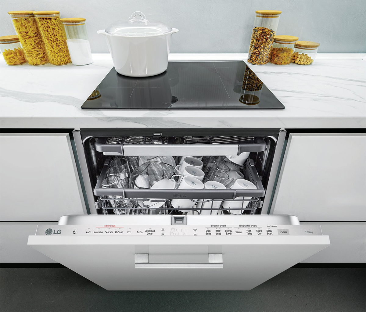 Vestavné myčky nádobí od LG jsou vybaveny inovativními technologiemi pro dokonalou čistotu a maximální efektivitu. Systém QuadWash™ s vícesměrnými tryskami myje nádobí ze všech úhlů, zatímco funkce TrueSteam™ s párou zaručuje hygienickou čistotu. Invertorový DD motor zajišťuje nejen tichý provoz, ale i dlouhou životnost. Osvětlení Info. osvětlení promítané na podlahu informuje o stavu mycího cyklu.